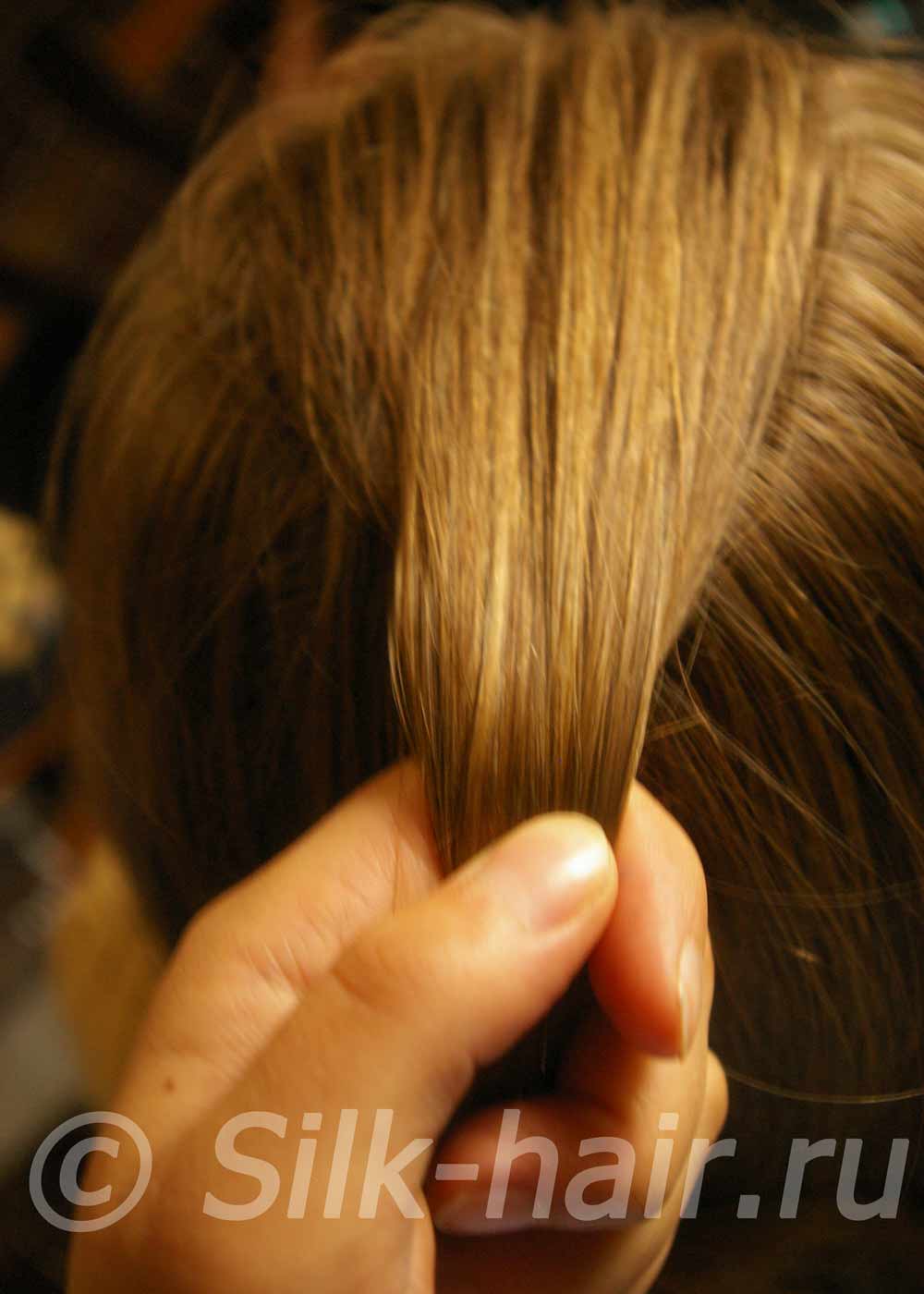Это очень важный момент. Левой рукой вы захватываете прядь с левой стороны головы и присоединяете её к своей нижней прядке.