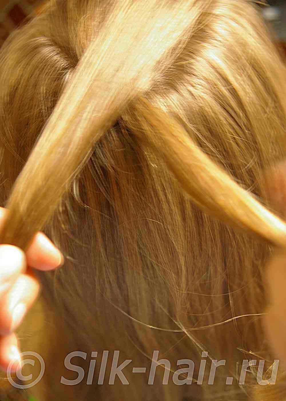 Разделите эту прядь на две поменьше и перекрестите их между собой. Правую — налево, а левую — под ней направо.