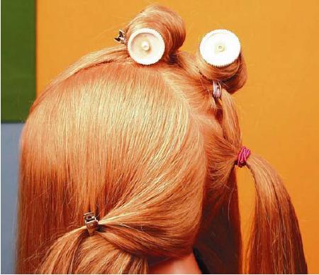 Разделите волосы хвоста на четыре части и туго накрутите на бигуди. Когда бигуди остынут — сбрызните все накрученные волосы лаком.