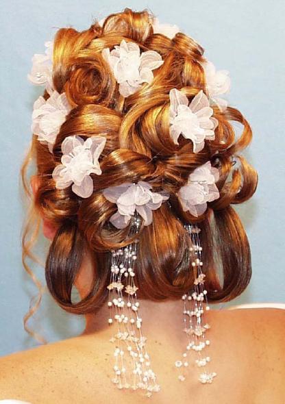 Разделите каждый локон на две-три части. Каждую часть закрепите невидимой заколкой или шпилькой внутрь прически и вокруг основания хвоста. Оставьте концы свободными. Прическа должны быть равномерной со всех сторон. Добавьте украшения в виде цветов.